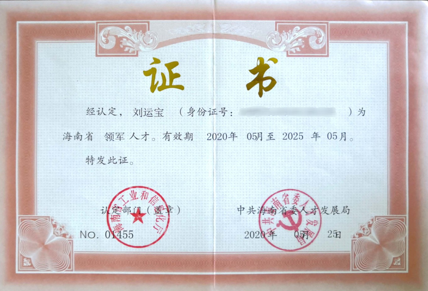 2020年5月,公司總經理劉運寶被評為海南領軍人才。海南領軍人才是海南省委省政府、海南省人力資源保障廳等部門為建設海南自由貿易區(qū)(港)引進的一類高層次人才。